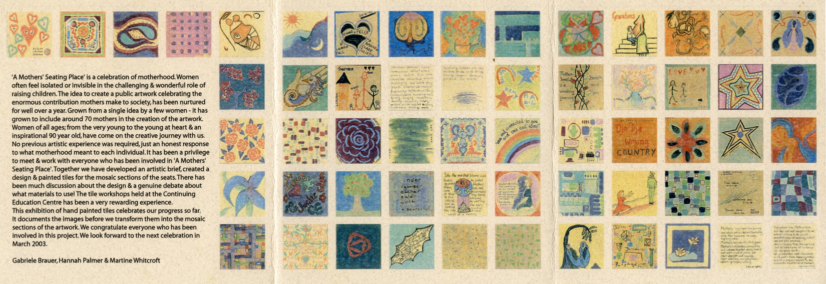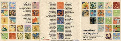 Katherine Seppings contributed two tiles for this community art project, honouring mothers, in Victory Park, Castlemaine. The words she hand-painted onto the tiles were from a letter she wrote to the local RSL seeking permission for the seat as a worthy inclusion to the park (2003).