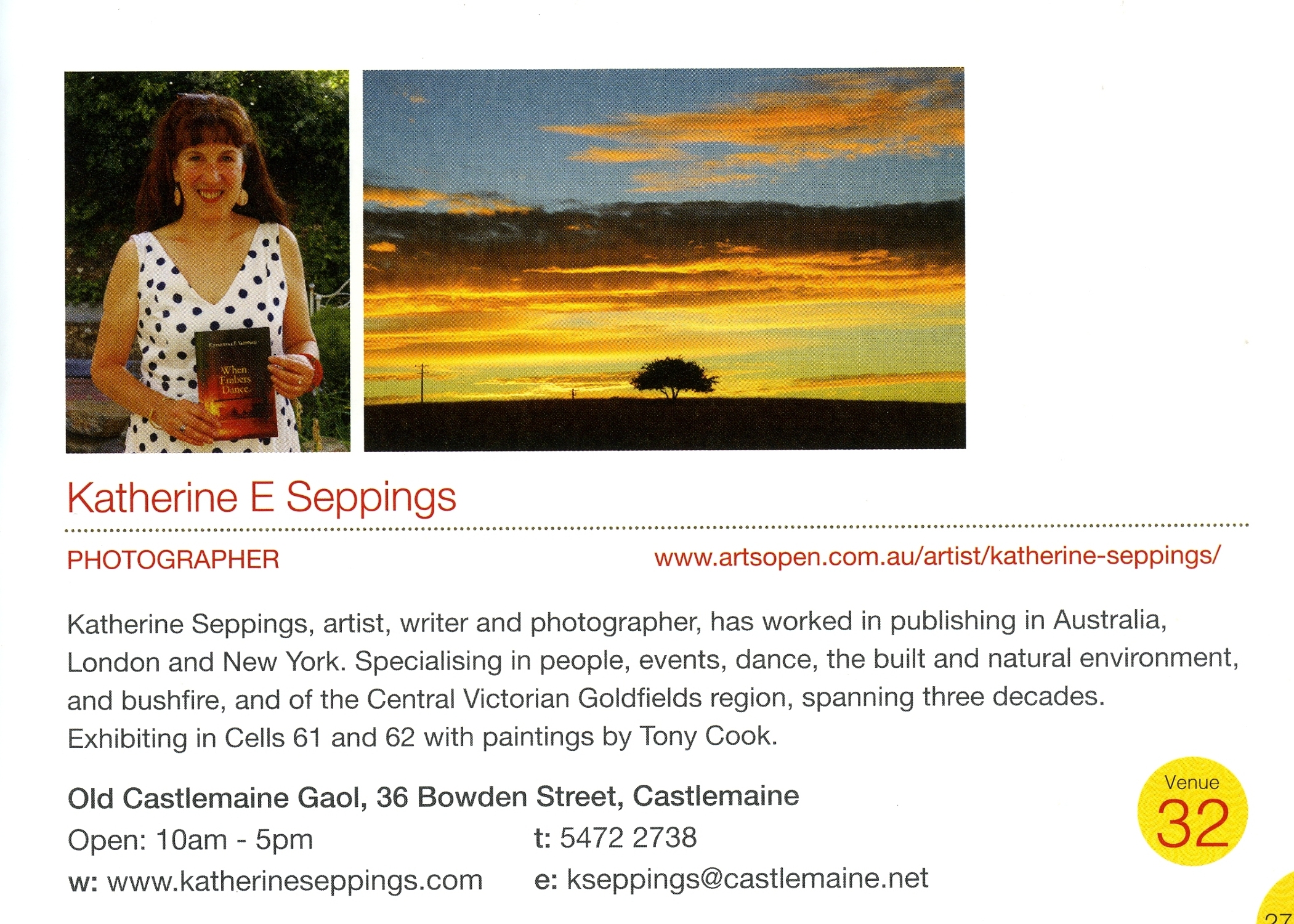 ‘Katherine has demonstrated a longstanding passion for and knowledge of the cultural and natural landscape and history of this district. She has unusual analytic, verbal, artistic and organisational skills, reflected in notable publications, photographic exhibitions and community involvement over 25 years.’ Angela Munro, Economic Development Officer, Mount Alexander Shire
