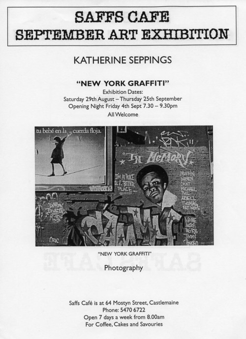 Katherine Seppings lived in Chinatown, New York City, for several years during the 1990s. On her return to Australia in 1998, she compiled a photographic study of graffiti from the Lower East Side of Manhattan, much of which was in the process of being ‘cleaned up.’
