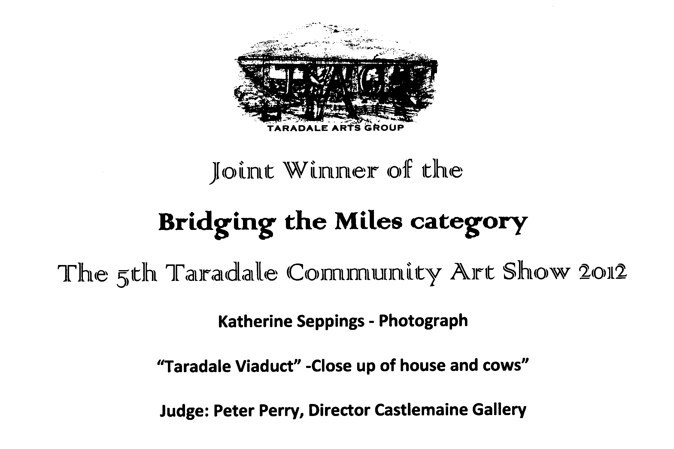 The B/W photograph of the Taradale Viaduct used on the Bridging the Miles exhibition invitation is the image that made Katherine Seppings a joint winner of The 5th Annual Taradale Community Art Exhibition.