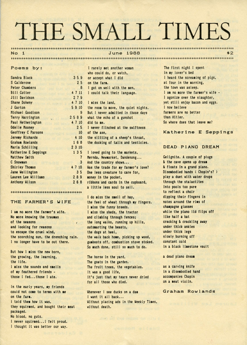 17 of my poems appeared in The Small Times No 1, No 2, No 4, No 5 (1988); No 15, No 16, No 17 (1990).
